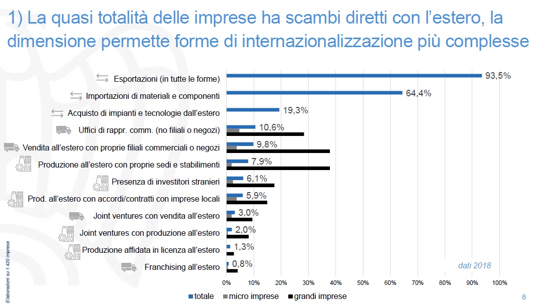 - La dimensione continua a influenzare la possibilità di effettuare forme di internazionalizzazione di crescente complessità e rischio: al crescere della dimensione aumenta la presenza all’estero, prima commerciale e poi produttiva;