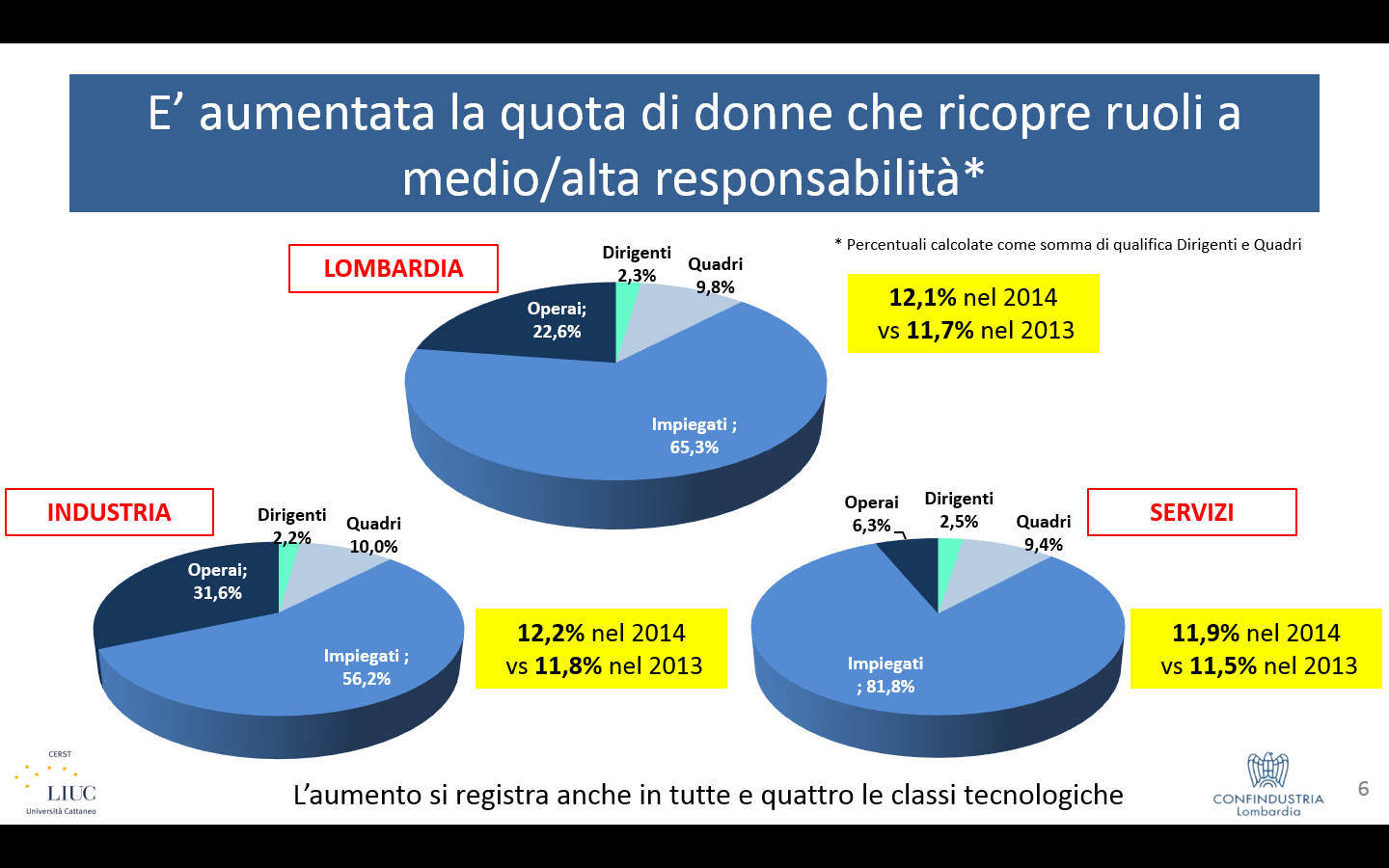 - Nel 2014 si conferma la tendenza (già avviatasi da qualche anno) all’aumento significativo della quota di donne che ricoprono professionali apicali o semi-apicali (quadri e dirigenti). Oggi le donne coinvolte in ruoli di media e alta responsabilità pesano in Lombardia per il 12.1% del totale dei dipendenti. (grafico 1);
