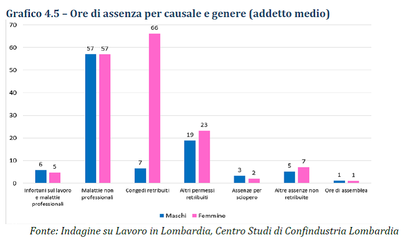 Il rapporto 2017, elaborato dal Centro Studi di Confindustria Lombardia su dati Istat 2016 e su un questionario al quale hanno partecipato circa 1000 imprese lombarde, si focalizza poi su orari e assenze dal lavoro: