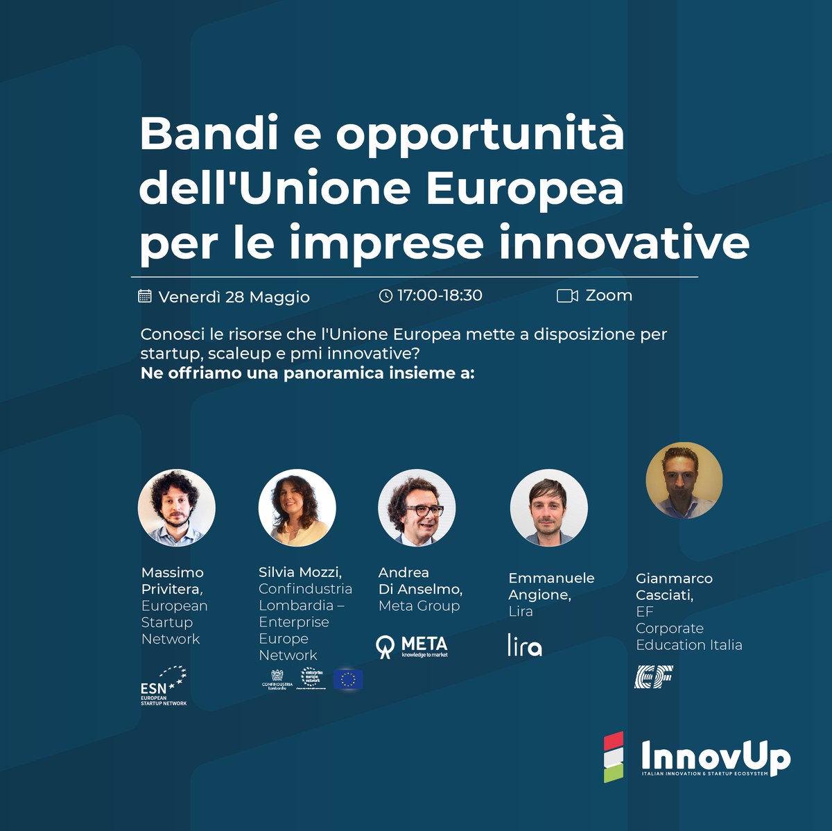 InnovUp ha organizzato questo webinar per offrire una panoramica degli strumenti e delle risorse che l'Unione Europea mette a disposizione per le Startup e le PMI innovative, per agevolarle e stimolarle a sfruttarli maggiormente.