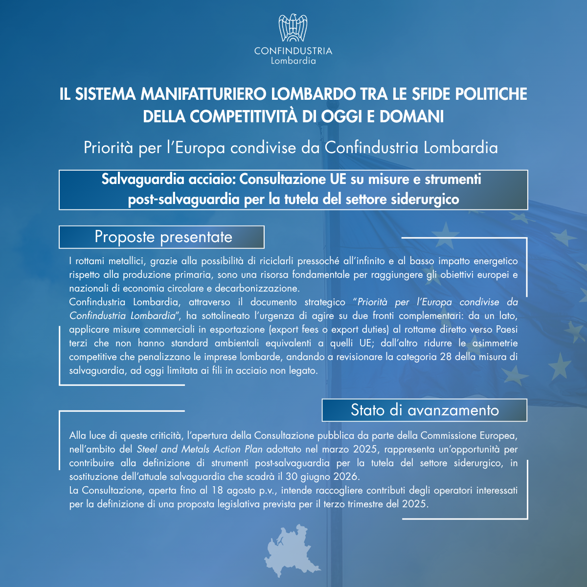 Con una siderurgia lombarda che rappresenta il 50% della produzione nazionale e Brescia primo polo italiano per i metalli non ferrosi, Confindustria Lombardia, nel documento “Priorità per l'Europa Condivise da Confindustria Lombardia”, ha evidenziato le principali urgenze per il sistema manifatturiero del territorio.