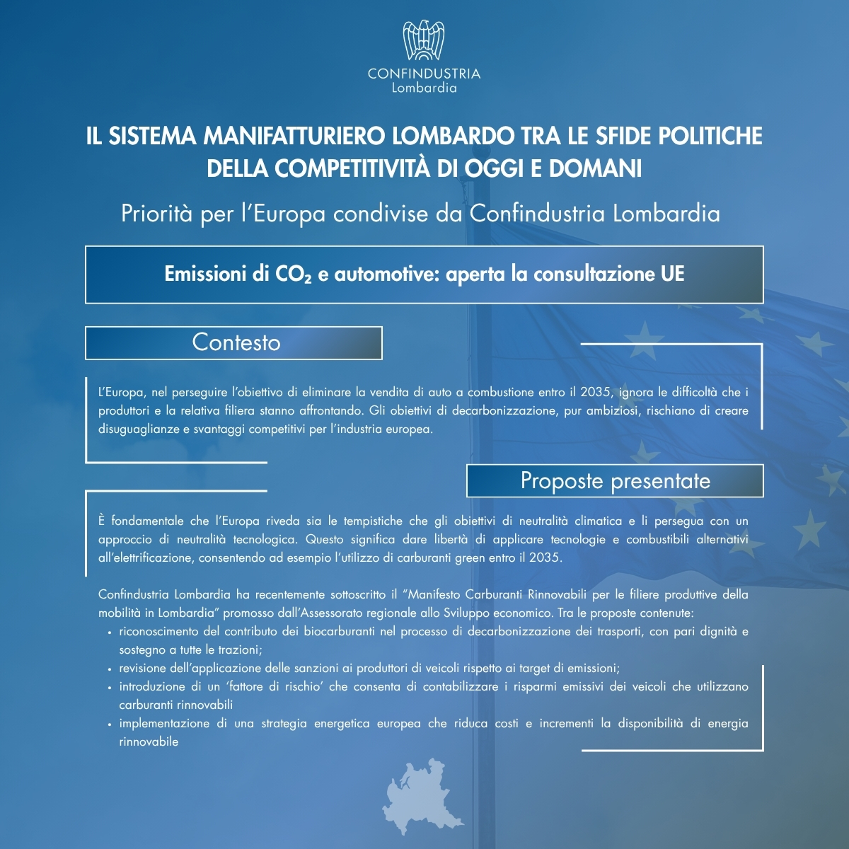 Confindustria Lombardia, nel documento “Priorità per l'Europa Condivise da Confindustria Lombardia”, propone un cambio di rotta a tutela di un settore produttivo fondamentale per l’intero continente indicando nell’approccio di ‘neutralità tecnologica’, nel riconoscimento del contributo dei biocarburanti e nella revisione delle sanzioni ai produttori le possibili soluzioni alla crisi industriale e allo svantaggio competitivo che le regolamentazioni UE e il Piano d’azione per l’Automotive hanno generato.